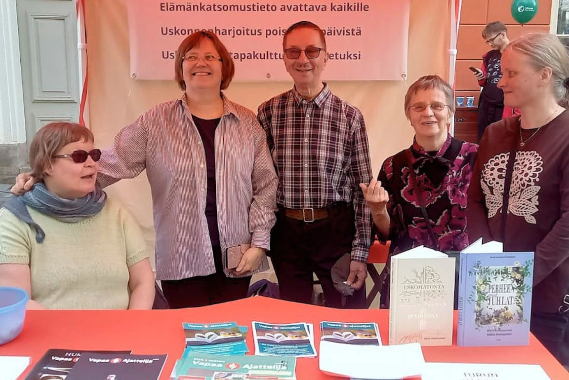 Turun päivänä 21.9.2025 toisensa tapasivat Turun vapaa-ajattelijat ja Luoteis-Lapin vapaa-ajattelijat. Yhdistysten jäsenistä paikalla olivat (vasemmalta) turkulaiset ET-aktivistit Anu Markkanen ja puheenjohtaja Ritva Ahonen sekä lappilaiset sihteeri Martti Vaattovaara ja taloudenhoitaja Paula Vaattovaara. Oikealla on Turun yhdistyksen jäsensihteeri Anu Salminen.