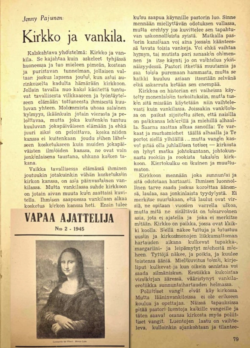 80 vuotta sitten ompelija, toimittaja ja kirjailija Jenny Pajunen (30.7.1909 – 11.3.1978) kirjoitti Vapaa Ajattelijaan 2/1945 varsin modernin oloisen artikkelin kirkosta ja vankilasta.